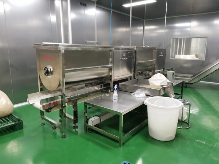 拌粉機(jī)→螺旋提料機(jī)→膨化主機(jī)→提升機(jī)→五層烘干機(jī)→冷卻機(jī)→混合機(jī)→熬糖設(shè)備→噴糖設(shè)備→提升機(jī)→單層高溫烘干機(jī)→冷卻機(jī)→振動(dòng)篩